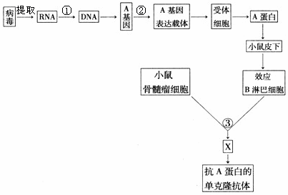 | 人类在预防与诊疗传染性疾病过程中,经常使用疫苗和抗体。已知某传染性疾病的病原体为RNA病毒,该病毒表面的A蛋白为主要抗原,其疫苗生产和抗体制备的流程之一如下图: |