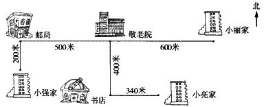 A.小丽从家出发向西走600米到敬老院。 B.小强从家出发向北走200米,再向东走500米到敬老院。 C.小亮从家出发向西走340米,再向北走400米到敬老院。 D.小亮家离敬老院最远,小强家离敬老院最近。 |