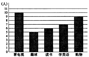 | (2)( )最受同学欢迎 A.购物 B.看电视 C.学英语 (3)喜欢看电视的比喜欢看书的多( )人 A.3 B.4 C.5 (4)读书和学英语的人数一共是( )人 A.11 B.12 C.13 D.14 |