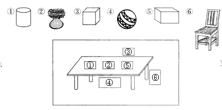 | A.椅子在桌子的右边,球在桌子的上面。 B.花瓶在桌子上面的中间,它的左边是圆柱。 C.长方体、正方体在花瓶的左边,长方体的上面是正方体。 |