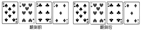 | 小明把如图所示的扑克牌放在一张桌子上,请一位同学避开他任意将其中一张牌倒过来,然后小明很快辨认了被倒过来的那张扑克牌是 |