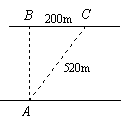 | 如图,某人欲横渡一条河,由于水流的影响,实际上岸地点C偏离欲到达点B200m,结果他在水中实际游了520m,求该河流的宽度为( )m。 |