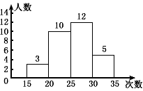 | 为了了解某校八年级学生的体能情况,随机抽查了其中30名学生,测试了1分钟仰卧起坐的次数,并绘制成如图所示的频数分布直方图,请根据图示计算仰卧起坐次数在25~30次的频率是 |