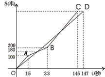 | 如图,在中学生耐力测试比赛中,甲、乙两学生测试的路程s(米)与时间t(秒)之间的函数关系的图象分别为折线OABC和线段OD,下列说法:①乙比甲提前2秒到达终点;②测试全程甲有两次变速,且速度逐渐增大;③比赛进行到29.4秒时,两人出发后第一次相遇;④比赛全程甲的测试速度始终比乙的测试速度快。下列说法正确的是 |