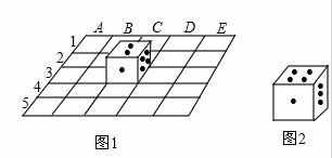 | 在五行五列的方格棋盘上沿骰子的某条棱翻动骰子,骰子在棋盘上只能向它所在格的左、右、前、后格翻动。开始时骰子在3C处,如图1,将骰子从3C处翻动一次到3B处,骰子的形态如图2;如果从3C处开始翻动两次,使 |