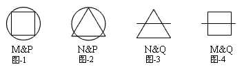 | 用M,N,P,Q各代表四种简单几何图形(线段、正三角形、正方形、圆)中的一种。图-1-图-4是由M,N,P,Q中的两种图形组合而成的(组合用“&”表示)。 |