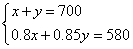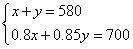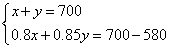 | “十一”黄金周期间,百家福商场“女装部”推出“全部服装八折”,男装部推出“全部服装八五折”的优惠活动,某顾客在女装部购买了原价x元,男装部购买了原价为y元服装各一套,优惠前需付700元,而他实际付款580元,则可列方程组为 |