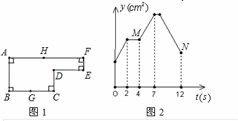 | 已知:如图1,点G是BC的中点,点H在AF上,动点P以每秒2cm的速度沿图1的边线运动,运动路径为: 图2,若AB=6cm,则下列结论中: (1)图1中的BC长是8cm; (2)图2中的M点表示第4秒时y的值为24cm2; (3)图1中的CD长是4cm; (4)图2中的N点表示第12秒时y的值为18cm2,其中正确的个数有 |