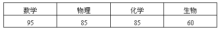 | 某学校举行理科(含数学、物理、化学、生物四科)综合能力比赛,四科的满分都为100分。小华四科的测试成绩如下表: |