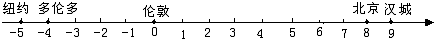 纽约与北京的时差为(-13);北京与多伦多的时差为(﹢12);