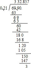 69.9÷0.21≈332.86(保留两位小数)