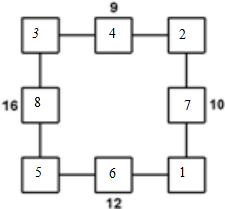 解答: 解:因为从1~8中,八个数字总和为36,而每条线的数字之和是9+10+12+16=47,故四个角三个数字的和等于47-36=11,在从1~8中,只有1+2+3+5=11,所以四个角上的数字应是1,2,3,5中的一个,三个数字之和等于9的只有:1+2+6=9,2+3+4=9,三个数字之和等于10的只有:1+2+7=10,2+3+5=10,当一边选1+2+6=9时,另一边只能选2+3+5,但是1,2,3,5只能位于四个角,所以不合题意,因为2+3+4=9和1+2+7=10中只有2重复,所以右上角的数字为2,左上角的数字为3,右下角的为1,左下角的为5,再根据各边数字之和求其它数字,所填数字如图.