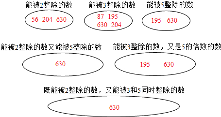 把56、79、87、195、204和630按要求填入下面的圈内.