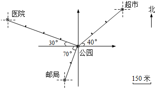 分析:(1)依据图上标注的信息,即可得出公园与超市、邮局的位置关系,又因图上距离1厘米表示实际距离150米,得出公园与超市、邮局的图上距离,即可求出它们之间的实际距离.