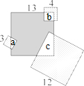 分析:因为边长为13的大正方形中阴影部分的面积=13×13-3个边长分别为3、4、12的小正方形各覆盖的面积,3个小正方形中阴影部分面积=4×4+3×3+12×12-3个边长分别为3、4、12的小正方形各覆盖的面积=169-3个边长分别为3、4、12的小正方形各覆盖的面积,即边长为13的大正方形中阴影部分的面积=3个小正方形中阴影部分面积,由此即可得出结论.