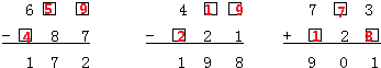 分析:(1)因为差个位上是2,所以被减数的个位上是2+7=9;又因为差的十位上是7,7+8=15,所以被减数的十位上是5,再看百位:6减去借位的1还剩下5,5-1=4,所以减数的百位上是4,即659-487=172,