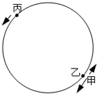 甲、乙、丙三人在圆形跑道上跑步,以如图中所示的地点与方向同时出发以相等速度跑步.他们每人跑完一圈都用14分钟.并且规定当两人相遇时立即各自反向以原速跑步.开始时,甲、乙、丙分别在圆形跑道直径的两个端点处,那么,他们第一次全部都回到各自出发点需用