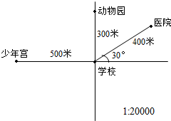 学校正西方向500米是少年宫,学校正北方向300米是动物园,学校东偏北30度距离400米处是医院.先确定比例尺,再画出上述地点的平面图.
