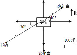 分析:因为图上距离1厘米表示实际距离100米,于是即可分别求出它们之间的图上距离,再据它们之间的方向关系,即可在图上分别标出它们的位置.此题可解.