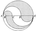 在如图中,除大圆外,所有的弧线都是半圆,且 AB:BC:CD:DE=1:2:3:4.图中有上、下两块阴影区域,如果上面的阴影区域面积为100平方厘米,那么下面的阴影区域面积为