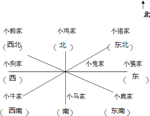 分析:因为小兔家在中心位置,根据图示方向指示,上北、下南、左西、右东,东和北之间为东北,东和南之间为东南,西和北之间为西北,西和南之间为西南,此题可解.