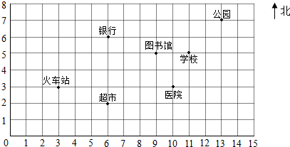 解答: 解:(1)火车站在地图上的位置是(3,3),银行在地图上的位置是(6,6).