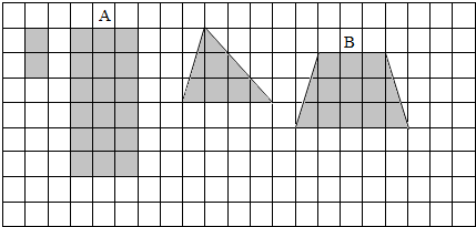 (2)面积是三角形2倍的梯形的面积为:(4×3÷2)×2=12(平方格),据梯形的面积公式,可使此梯形和三角形等高,其上底上底+下底=12×2÷3=8(格),所以这梯形的上底可为3格,下底可为8-3=5(格),高为3格,由此得下图中图B.