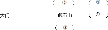 “走进服装城大门,正北面是假山石和童装区,假山的东边是男装区,西边是女装区.女装区的北面是中老年服装区”.根据以上的描述请你把服装城的序号标在适当的位置上.①童装区②男装区③女装区④中老年服装.