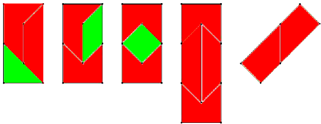 按提供给你的图纸分别从红色卡纸上剪下 8 块拼板,从绿卡纸上剪下 6 块拼板,共 14 块拼板.从中任意选取若干块,可拼成一个长方形,如下图一与图二.请你另外再找 5 种拼长方形的方法,并画出示意图.(选取拼板的颜色、数量、正反面不限,举例的不能再用.若两种方法通过翻转可互相得到,就视为同一种.由几个小长方形组合成一个大长方形,如图三是由两个图一拼合而成,不计作一种方法)