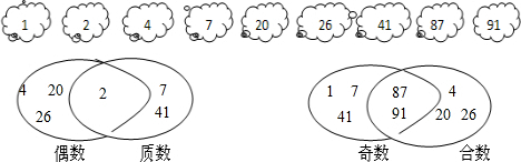 点评:解决此题要明确奇数、偶数、质数和合数的意义,要注意1既不是质数,也不是合数,但1是奇数.