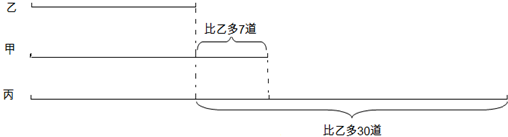 画图时,甲、丙分别比乙多做7道、30道,很容易表示出来.丙是甲的2倍也就是丙包含两个甲,可以很快知道甲做了:30-7=23(道).三人一共做的数量就是比4个23少7道.