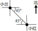 小红和小兰做游戏,小红站在小兰东偏南45°的方向上,距离1米.那么小兰站在小红西偏北45°的方向上,距离是1米.