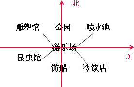 (3)游乐场在游船的北方,雕塑馆在游乐场的西北,因此坐完游船回来先向北走到游乐场,游乐场再向西北走就到雕塑馆了,