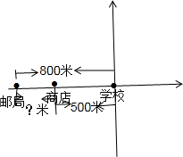 分析:因为邮局和商店都在学校的正西方,邮局离学校800米,商店离学校500米,那么,邮局离商店:800-500=300米;据此解答.