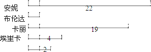 在线段图中把“差”的关系都表示出来了,最后由布伦达和埃里卡一共进了6个球得到布伦达的进球数是多少,所以这 5个人共进了1×5+22+19+4+2=52 个球.
