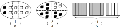 图3是把一个长方形的面积看作单位“1”,把它平均分成5份,每份是它的$\frac{1}{5}$,其中11份涂色,表示11个$\frac{1}{5}$,是$\frac{11}{5}$.可看作看作是2个“1”加上$\frac{1}{5}$,即2$\frac{1}{5}$.
