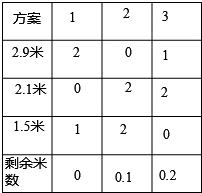 分析:要长2.9米、2.1米和1.5米的钢材各100根.一种简单的想法是:在每一根原料上截取2.9米、2.1米和1.5米的钢材各一根,这样每根原钢材剩下0.8米的料头,剩下的料头总数为0.8×100=80米.