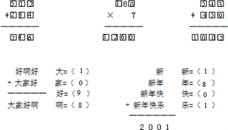 (5)由相加的和的最高位是2,可以得到“新”=1,因为个位向十位进一,十位向百位进一,所以“年”=8,“快”=0,“乐”=1,由此填出答案即可.( )