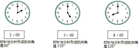 分析:根据钟表的认识,分针指向12时时针指向数字几是几时;用量角器即可量出时针与分针形成的角的度数.或根据钟面上12个数字把钟面平均分成12份,每份所对应的圆心角是360°÷12=30°,即每两个相邻数字间的夹角是30°,可求出每个整时分针与时针的夹角的度数.