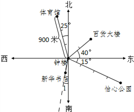 (1)体育馆在钟楼的北偏西25°方向,距离是900米;