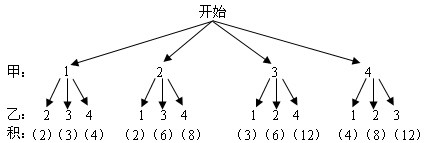 分析:先通过画图,进行枚举,找出积共出现的情况数,然后找出积为奇数的情况有2种,积为偶数的情况有10种,进而根据求一个数是另一个数的几分之几,用除法求出乙获胜的概率.