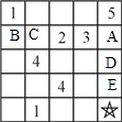 分析:先确定A格里的数字,A≠2、3、5,只能是1或4,如果是4,那么B和C的位置不论谁等于1都与题意矛盾,所以A=1;同理,★≠1、5,只能等于2、3、4,由于D和E所在的行都有数字4,所以D、E的位置不可能是4,所以只能是★=4,据此解答即可.
