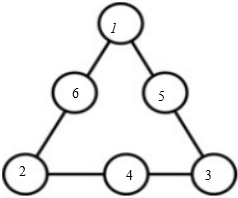 把1、2、3、4、5、6填入右图圆圈中,使每条边上三个数字的和都得9.