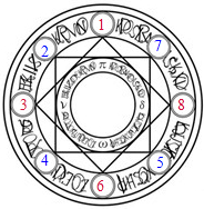 因为18=1+3+6+8=2+4+5+7,因此有一个正方形的顶点4个圈内分别占1、3、6、8只,另一个正方形的顶点4个圈内分别占2、4、5、7只.