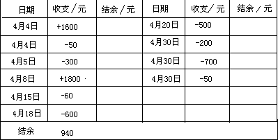 4月30日 本月伙食费700元       4月30日  本月通讯费50元