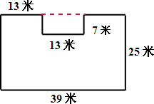 分析:这个图形的面积=长39米宽25米的长方形面积-长13米宽7米的长方形面积,依此列式计算即可求解.