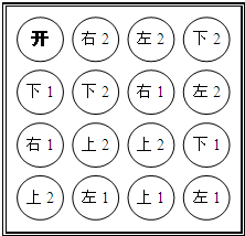 如图是一把游戏锁,上面有16个按钮.游戏规则如下:按照按钮上的提示,按遍全部按钮,才能把锁打开.比如,当你按下第1行的第2个按钮“右2”时,就要按照提示,向右移动2格按“下2”钮,再按照提示按“下1”钮…,为了打开这把游戏锁,请你选择第一次应按的按钮,它在第