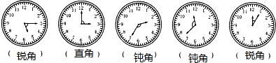 说一说,每个钟面上时针和分针所组成的角是锐角、直角还是钝角?