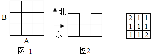 在图1中的空格中摆放大小一样的正方体,每个空格中至少放一个.当你站在A点向正北方向看,站在B点向正东方向看,看到的形状都如图2所示.至少有______个正方体.