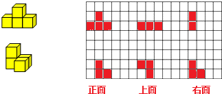 分析:观察图形可知,第一个图形:从正面看到的是2层:下层3个正方形,上层1个靠中间;从上面看到的图形是一行3个正方形,从右面看到的图形是一列2个正方形,据此即可解答问题;